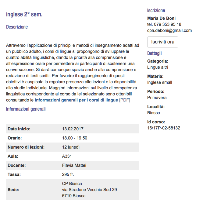 Ci sono ancora alcuni posti disponibili per il corso II semestre a Biasca, che si terrà lunedì dalle 18:00 alle 19:40 a partire da lunedì 13 febbraio 2017.